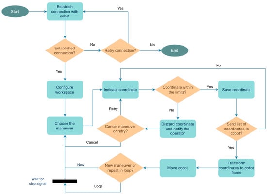 The operation of the system is shown in Figure 1. Fundamentally, the structure consists of a closed loop that analyses and transmits the specified coordinates to the collaborative robot. Once the cobot completes a manoeuvre, the user is offered the possibility to repeat the current program in a loop or to plot the points of a new trajectory. If the user indicates a coordinate outside the range of the robotic arm during planning, its transmission is cancelled. At this point, the option is offered to delete the path planned so far or to correct only the last coordinate. The system is terminated as soon as the user closes the application.