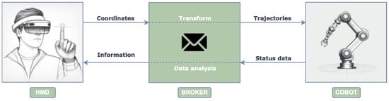 During the operation of the system, the nodes are responsible for executing the established functions for interaction, transmission and processing of data []. This dynamic is illustrated in the schematic depicted in Figure 2, which shows the data flow within the system. One of the nodes subscribes to the topic where the coordinates are published by the HMD. In this way, it is in charge of translating the user’s instructions into programs that are understandable to the cobot. Meanwhile, another node analyses the state of the robotic arm and publishes messages in a topic that are used by the HMD to project digital elements.