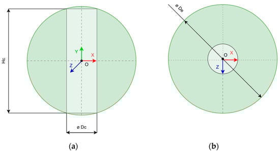 - The verification that a point lies within the cobot’s workspace. For example, if we define the cobot workspace as a cylinder of diameter (dc) and height (hc), inserted in the centre of a sphere of diameter (ds), larger than dc, a point is considered within this zone if it fulfils certain conditions.where ox, oy and oz represent the 3D coordinates of the centre of the cobot base in the HCS. Figure 3 shows the representation of the cobot workspace described with the example coordinates and the reference system used for the calculation of the equations.