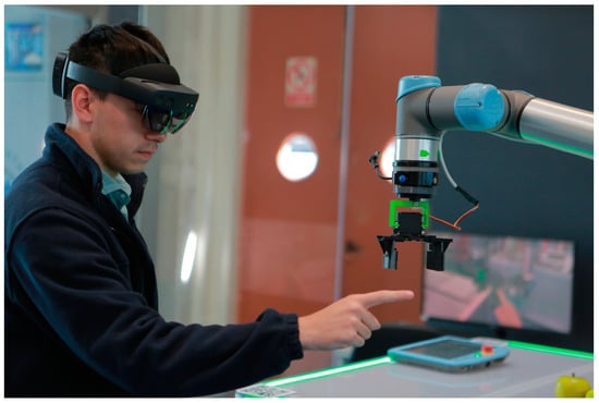 The cobot used is the UR5e from Universal Robots. The transmission of information between the HL2 and the UR5e is through ROS. The ROS ecosystem is the most widely used middleware in the robotics community and is based on the publisher/subscriber communication model. Thus, ROS is ideally suited to the system architecture []. Figure 4 shows a user operating the UR5e cobot through Microsoft Hololens 2. The user is indicating a point on a trajectory in space with his index finger.
