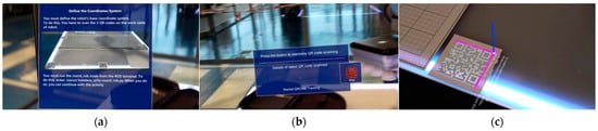 This section details the implementation of an object pick and place activity using the proposed solution. When the system is started, the connections are checked and the workspace is defined. This definition is carried out by detecting three QR codes placed on the cobot’s worktable. These codes contain crucial information that the mixed reality application uses to build the matrix accurately and position the UR5e digital workspace in the real environment. When the QR codes are scanned, the application projects a digital 3D model in the form of a trihedron on each of them, allowing the user to confirm the correct execution of this process. The 3D coordinates defining the centres of these trihedrons coincide with the points p1, p2 and p3 previously specified in Section 3.2. Each QR code incorporates a unique message intended for precise construction of the . This approach allows the user to scan the QR codes in any sequence, without affecting the correct derivation of the matrix. Figure 6 shows the process of reading a QR code where it can be seen how the user observes in the HMD lens digital elements that help him or her during the process.