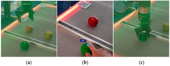 Araiza-Illan et al. [] presented a demonstration using HoloLens to intuitively reprogram a robotic packaging application. An AR interface is introduced that enables fast and effective reconfiguration of robots, adapting them to changes in production orders. It uses simple hand gestures and spatial mapping to recognize objects and QR (Quick Response) codes. This facilitates precise location of landmarks and accurate placement of objects on trays. The demonstration illustrates how the packaging application can be reconfigured without requiring prior knowledge of robot programming. This suggests the possibility of implementing further enhancements to offer more parameterization options.