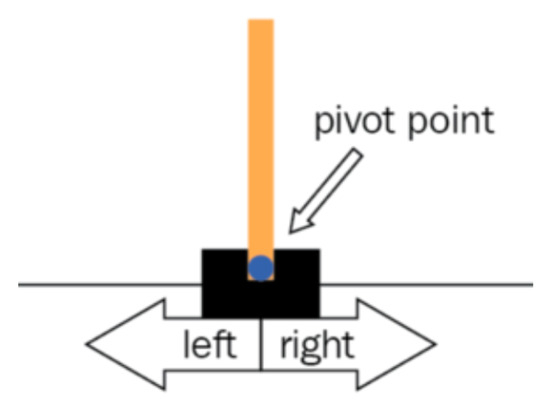 In [9], we use Cartpole as the scenario for this work. Cartpole is an environment for reinforcement learning provided by the OpenAI Gym library (https://gym.openai.com, accessed on 4 December 2023), in which a pole is attached to a cart through an unactuated joint, and both move along a friction-less track, as depicted in Figure 1. The agent controls the cart by moving it left or right, and the challenge is to prevent the pole from falling over due to gravity. To represent the state of the system, the agent has access to observations containing four variables: cart position, cart velocity, pole angle, and pole angular velocity. A fall is determined when the pole angle exceeds 12 degrees from the vertical or when the cart moves out of bounds.