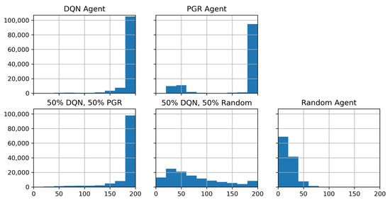 Histogram of frequencies indicating up to which step each policy was able to keep the pole standing up. Policies are in this order (left to right, top to bottom): DQN (all actions are chosen by the original policy), PGR (all actions are chosen by the policy graph), HEX (in each step, the action is chosen at random between the original policy and the policy graph), HRD (in each step, the action is chosen at random between the original policy and purely random), and RND (in each step, the action is chosen at random from all valid actions). A successful policy reaches step 200. Please note that the random agent (RND) cannot keep the pole straight and almost never reaches step 50, while the agents trained using reinforcement learning (DQN) and the simplified agent (PGR) or combined (HEX, which is 50% DQN and 50% PGR) almost always succeed (they reach step 200), especially when avoiding failing during the first steps.
