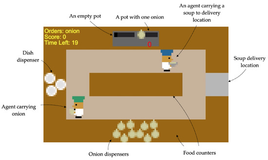 In this paper, we have used the PantheonRL [23] package for training and testing an agent in Overcooked-AI [24]. Overcooked-AI is a benchmark environment for fully cooperative human–AI task performance, which is based on the popular video game Overcooked (http://www.ghosttowngames.com/overcooked, accessed on 15 November 2023). The goal of the game is to deliver soups as fast as possible. Each soup requires placing up to three ingredients in a pot, waiting for the soup to cook, and then having an agent pick up the soup and deliver it. The agents should split up tasks on the fly and coordinate effectively in order to achieve high rewards.