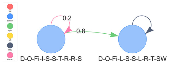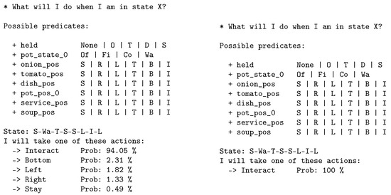 The answer to this question consists of aggregating the probabilities of possible actions in the policy graph from all the input states that the user wants to check. Let be the computed policy graph, be the target state region, and dist: be a measure of distance between a discretised state and a state region in S. (This distance function can depend heavily on the environment and on the predicate set chosen. An in-depth analysis of possible functions is out of the scope of this paper, but it will be part of future work. For the sake of proof-of-concept, the distance function we have chosen for the work presented in this paper consists of: let and , we define distdiff, where diff is the function defined in Section 4. For example, this measure for the states in Figure 6 would be dist as only four predicates change value between them.) Very similarly to the possible courses of action of a surrogate agent defined in Section 4, there are three possible cases regarding the information available about the state region X.