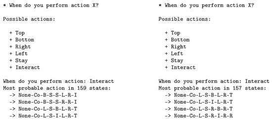 Example output of the algorithm When do you perform action a? from policy graphs generated for a PPO-trained agent. On the left, the result for the stochastic policy graph; on the right, the result for the greedy policy graph.