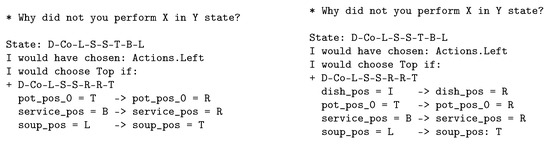 As an example, consider the answer to “why the agent did not take the top action in state {held(Dish), pot_state(Cooking), onion_pos(Left), tomato_pos(Stay), dish_pos(Interact), pot_pos(Top), service_pos(Bottom), soup_pos(Left)}?”, as seen in Figure 9. This state is not part of the policy graph, whereas the one where dish_pos(Stay) indeed is (the difference being whether the dish pile is in the agent’s interact position (s) or south (). The predominant action in state is going to the left. This algorithm’s output is the list of nearby states where the chosen action is top. For example, {held(Dish), pot_state(Cooking), onion_pos(Left), tomato_pos(Stay), dish_pos(Stay), pot_pos(Right), service_pos(Right), soup_pos(Top)}, where the nearest soup was on top. Seeing the difference, a human interpreter may understand that the agent has taken the action which brings him closer to the soup. The output of the algorithm itself is arguably not an explanation, but it gives information which could be useful in providing one.
