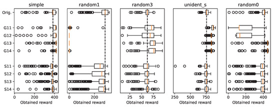 Obtained rewards by the original and surrogate agents in all layouts. Orig. stands for the original agent, and G and S stand for the greedy and stochastic surrogate agents. G11 to G14 and S11 to D14, respectively, refer to the subsets of predicates D11 to D14.