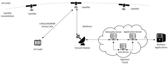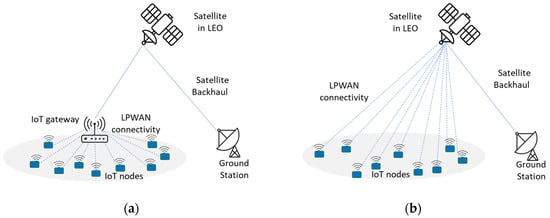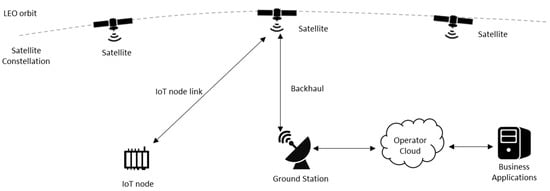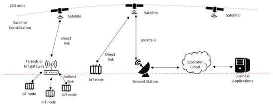 - DtS-IoT model with satellites in LEOs: IoT nodes connect directly to satellites in LEO orbits, as seen in the Lacuna or Astrocast constellations [60].