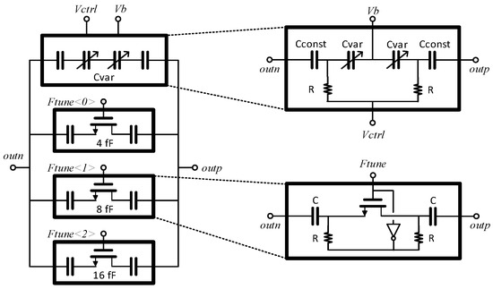 Figure 4, is used to select the frequency range. It consists of the two varactors that make the continuous tuning range connected in parallel with blocks of other capacitor arrays (4 fF, 8 fF, 16 fF) that are partially enabled by the control signal