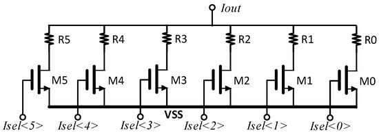 Isel<0> and the corresponding resistor R0. The rest of the current control is performed by enabling the resistors R1 to R5 through the transistors M1 to M5, respectively, following a thermocode logic. The minimum and maximum values of each delay element are between 1 mA and 2 mA.
