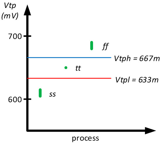 The decision circuit consists of two comparators that compare the process-dependent voltage Vtp with the constant levels of Vtph and Vtpl. In the typical case, the value of Vtp is between the voltages Vtph and Vtpl, while in the fast–fast (ff) corner, Vtp is greater than both Vtph and Vtpl, and in the slow-slow (ss) corner, Vtp is lower than Vtph and Vtpl. The result of the comparison is the 2-bit digital word Process_ctrl<1:0> that enables or disables the corresponding compensating resistors in the delay element.