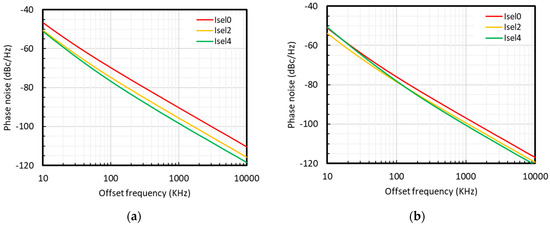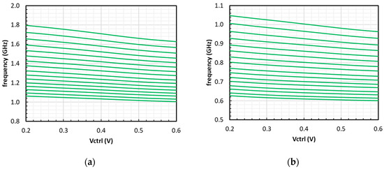 According to phase-locked loop (PLL) system noise analysis, including the noise contribution of all the sub-blocks in the loop, the target phase noise of the oscillator should be better than −90 dBc/Hz at 1 MHz offset in the higher operating frequency in order to meet the random jitter performance specified by the protocols. Also, the desired power consumption of the VCO has been extracted from the total PLL power consumption budget, and for the HF bands, it should be less than 6 mW, while for the LF bands, it should be less than 4 mW.