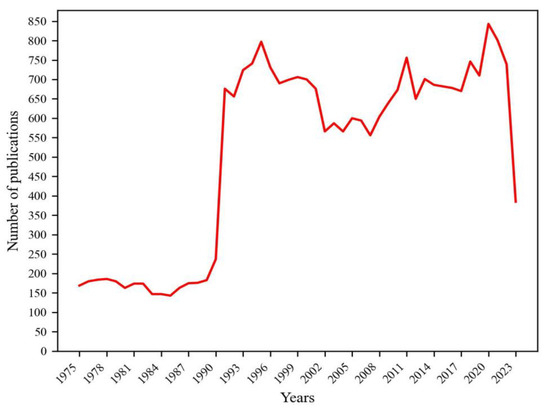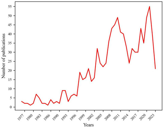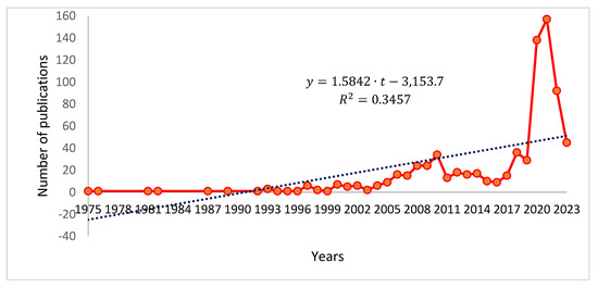 Based on a comparative analysis of the trends shown in Figure 3, Figure 4 and Figure 5, a similarity in the profiles of the curves for publications from 2020 to 2023 can be noticed due to the fact that publications on the COVID-19 pandemic have included references to previous pandemics in the literature review and the distribution of the number of publications is of a Gaussian type.