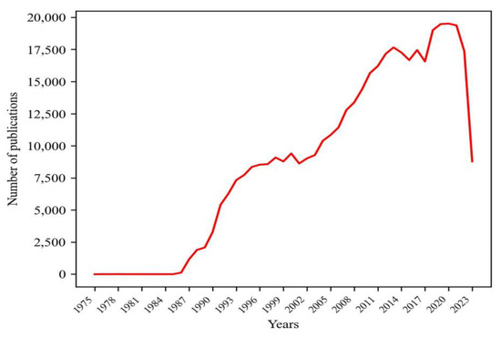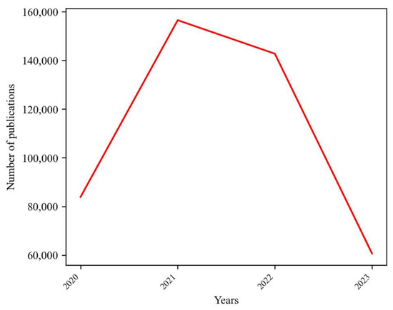 The number of publications in WoS [27] for COVID-19 between 2020–2023 is 443,878. A graphical representation of this number, by year of publication, is shown in Figure 5.