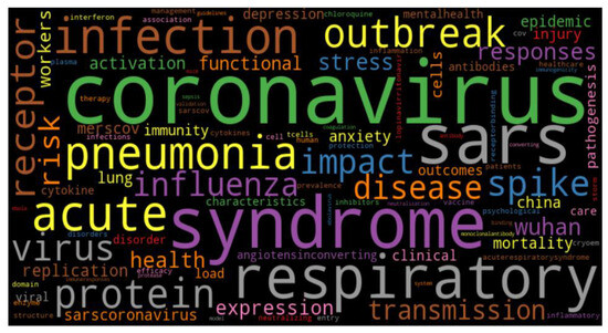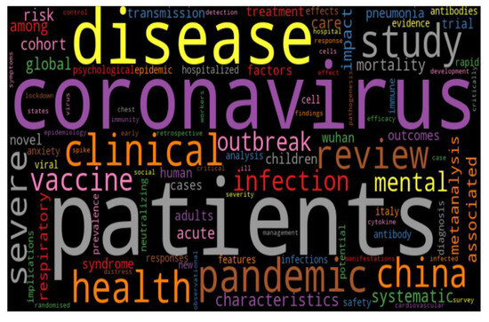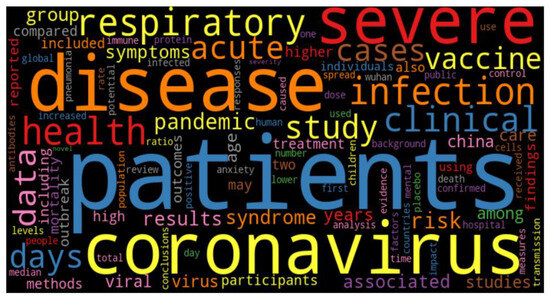 The frequency of use of a word is given by the number of occurrences of the word within the volume of data in the papers analyzed. We use the word cloud to graphically represent the words identified in the analyzed papers, in a visual form, so that their size is proportional to their frequency of use. The dictionary represents, in this context, a totality of words used in the analyzed papers, representative of the domain or subject analyzed. Considering that during the COVID-19 pandemic, the number of scientific research studies addressing this topic increased a lot, we searched the WoS database. There were found 443,878 papers that contained the word “COVID-19”. We extracted from the WoS database the first 1000 publications (this number depended on the limitation imposed by WoS) that were the most cited, and we formed three data collections containing the fields “title”, “abstract”, and “keywords”, respectively. For each of the three data collections, we took the most used words, identified by their frequency of use (sorted in descending order). In this way, we took into account, in our analysis, the most used words in the respective field/subject used in the “title”, “abstract”, and “keyword”, respectively. We continued the analysis with the word cloud representation using natural language processing in Python. The general description of the logical processing flow to obtain the results in our study is as follows: