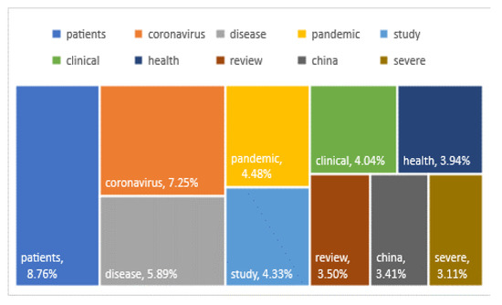 The frequency of occurrence of the top 10 words is represented in Figure 7 where the word “patients” is the most used at 8.76%.