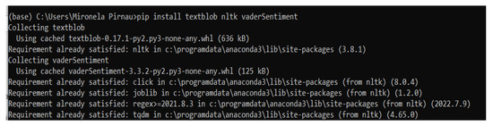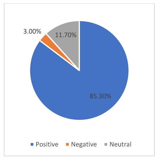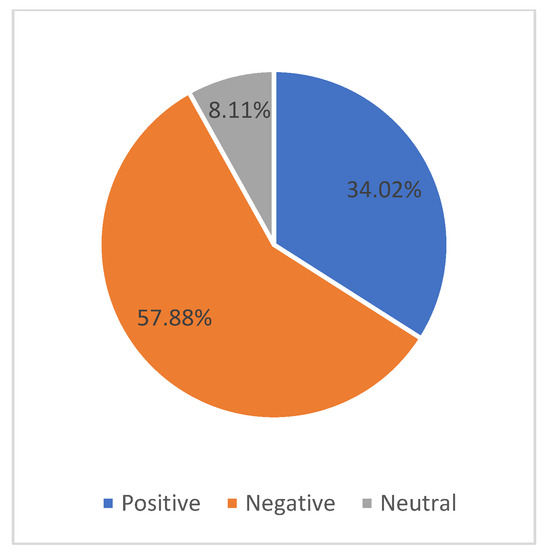The study of opinions and their evaluation can be conducted using Natural Language Processing (NLP) through different specific algorithms of sentiment analysis or opinion mining. The result of sentiment analysis is the contextual polarity of the text [44], which can be positive, negative, or neutral. There are different methods and algorithms for evaluating opinions and determining the corresponding sentiment [44,45,46,47,48]. Sentiment analysis can be performed per document (Document Analysis), which determines the opinion expressed by a document; per sentence (Sentence Analysis) to evaluate the opinion conveyed by the sentence; per entity or feature (Entity and Aspect or Feature Analysis), which evaluate the opinion conveyed on the entity. It can be realized by training a neural network (Supervised Learning) using SVMs (Support Vector Machines) and NaiveBayesClassifier algorithms (NB), SentiWordNet, social network analysis (SNA) [43,49,50,51,52,53,54,55]. Stine [56] went further with the analysis and managed to detect the sarcasm transmitted in the text.
