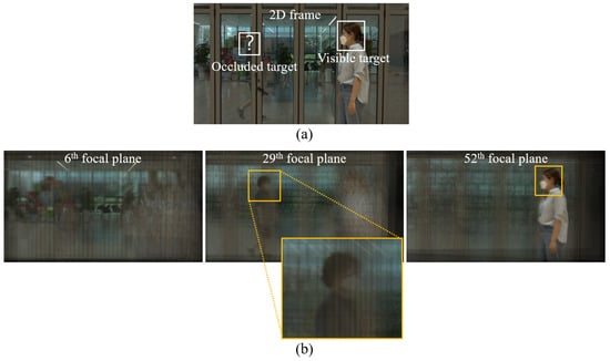 Comparison of 2D and plenoptic multiple object tracking when occlusion occurs. (a) One of the target objects is invisible in a 2D sequence due to an occluder. (b) Weak appearance of a corresponding target object exists in a plenoptic video constituted of multifocal planes along the depth.