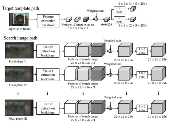 In the proposed plenoptic tracker, the foundation model for object tracking uses SiamRPN++ [13]. At the first frame, after the user manually designates the region of interest on the 2D frame, the target object is tracked by performing similarity calculation using the Siamese network for all focal planes in the focal stack for the subsequent frame. Figure 2 depicts the extraction of features in the focal planes that make up plenoptic videos. The ResNet50-based backbone extracts both encoded representations of the target object template and the focal plane, and after extracting and concatenating three intermediate features, the similarity was used as the final feature map for prediction. The feature map extracted here consists of 256 channels, and in the target object exemplar, two size feature maps for bounding box coordinate prediction and for objectness classification, respectively. For each focal plane used for a search image, a feature map of size is extracted; thus, if there are K focal planes in the focal stack, a total of K feature maps are fed into the RPN.
