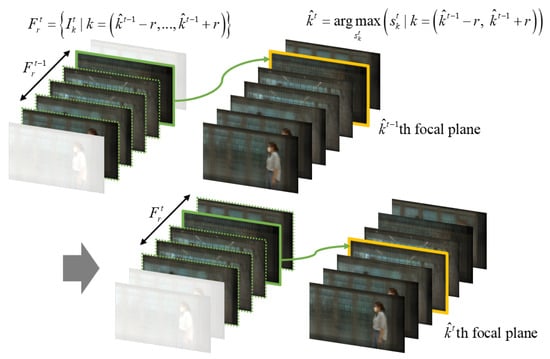 When the optimal focal plane has the maximum similarity and whose index is selected from the focal stack of the -th frame (i.e., previous frame), the operation is performed considering only the focal planes of r centered on the -th focal plane, and then a new focal stack having a limited range is formed.