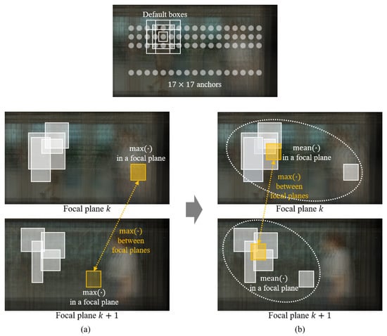 In general, similar to SiamRPN++, which is employed for our baseline tracker, tracking algorithms including RPN require heuristic tuning for several hyperparameters of anchors such as default bounding boxes and scales [14]. When detecting the highest similarity with the target object, the possibility of error is low because only the spatial region is covered. However, the region is expanded to the spatial region times focal planes in the plenoptic sequence. In a plenoptic sequence, the operation is computed on predicted bounding boxes of each focal plane, and then the operation is calculated again for as many focal planes as the number of focal planes. Here, the voting is repeated, and errors accumulate due to increased the number of combinations. Figure 6a illustrates the problem of the existing method, as the operation between the predicted bounding boxes of the maximum similarity anchors selected for each focal plane is performed again in all focal regions; errors caused by the operation accumulate.
