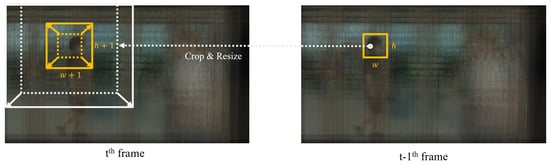 where and represent a skipped frame number increment (default ) and motion speed, respectively. Let and be the distances between the center coordinate of the previous second frame and the center coordinate of the previous frame, and between the center coordinate of the previous frame and the center coordinate of the current t-th frame, then the differential motion speed can be calculated: