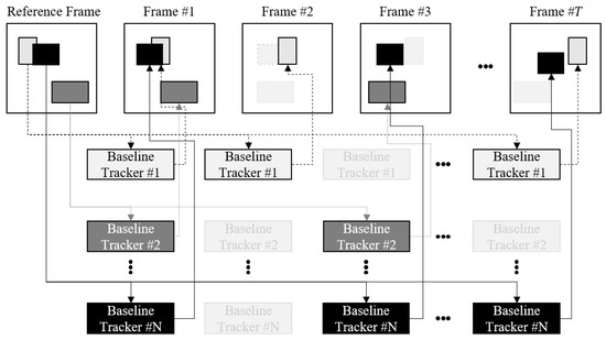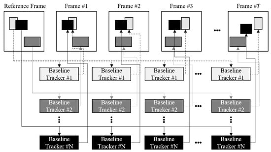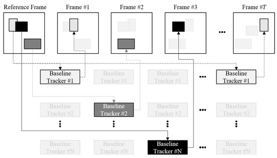The parallelization of MOT provides strong tracking performance, but the computational complexity is high because there are as many baseline trackers as there are objects and they operate simultaneously. The basic method for improving speed in MOT is to split the work evenly as depicted in Figure 9. Here, individual trackers are assigned to objects, with only one tracker operating per frame, while others wait for their turn. If there are N trackers, tracking is performed once per N frames, which results in a speed improvement of N times compared to a situation in which all trackers are operating.