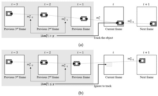 Figure 11 visualizes the criteria for skipping the tracking of a specific target. The main idea is that if the target movement varies dynamically, the corresponding tracker continuously tracks the target as depicted in (a). On the other hand, if the motion of a target is small enough, the corresponding tracker does not track its target in that frame as shown in (b). Towards this, at first, each tracker in a frame calculates the central distance of n-th object coordinates between frames: