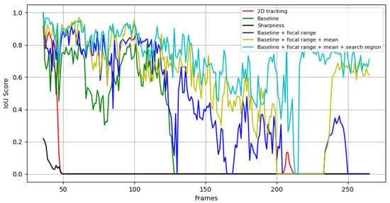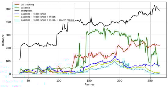 At first, we verified the performance of plenoptic VOT (i.e., tracking a single target). Experiments were performed in an ablation study manner; thus, the results show the improvement level of plenoptic tracking following adding each proposed module. Additionally, to show the superiority of our proposed method, the previous plenoptic VOT model introduced by Bae et al. [25] was also compared. The results of evaluated central distance and IoU are shown in Figure 12 and Table 2, and Figure 13 and Table 3, respectively.
