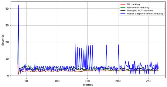 As shown in Figure 14 and Table 4, the general tracker failed to track after an occlusion occurred (∼100th frame), and the central distance was constantly increased due to the accumulation of errors. Differing from the 2D scenario, the other plenoptic MOT algorithms showed they were able to achieve stable tracking performance in spite of occlusion. Similar to central distance results, as shown in Figure 15 and Table 5, IoU represents the matching ratio between the ground truth and predicted bounding box; thus, the higher the % value is the higher the tracking performance. In the case of the plenoptic MOT baseline algorithm, which performed tracking for three objects in each frame, it showed the best performance with 77% IoU, but the object tracking speed was the lowest as shown in Figure 16 and Table 6. When using the fair-time scheduling technique, there was a speed improvement of about three times (i.e., similar to the number of target objects), but the tracking performance decreased to 51%. When using the motion adaptive scheduling based on motion speed, the overall tracking speed was improved by approximately 18% compared to the naïve approach, while the tracking performance was relatively lower but acceptable. Note that the reason why the latency at the first frame is that it needs to set up a buffer to store past movements.