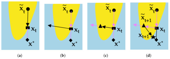 Figure showing the intuitive approach to thinking about HopSkipJump: (a) a binary search of the boundary; (b) the update ; (c) a geometric progression followed by the update ; (d) a binary search and the update .