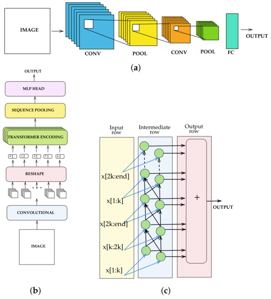 (a) CNN architecture, (b) SpinalNet architecture, and (c) CCT architecture.