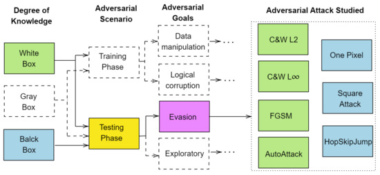 Currently, the research area of adversarial attacks and defense is highly active, and there is a growing number of studies. According to the proposed taxonomy [13], adversarial attacks can be injected at the training or testing phases. Perturbations added to the input data to generate adversarial examples can be specific or universal. In the first case, different perturbations are added to each input, resulting in different perturbation patterns. In the latter case, added perturbations are the same [10]. Based on the number of iterations required to generate an adversarial example, attacks can be either one-shot/one-step or iterative [10]. In addition, the types of adversarial attacks can be tentatively classified based on the degree of knowledge, adversarial scenarios, and goals [13]. If the attacker has complete knowledge of the neural model parameters, then the attack is known as a white-box attack. In contrast, if the attacker has zero knowledge, it is known as a black-box attack [14]. In the case of a limited degree of knowledge, the attacks belong to the gray-box class. Depending on the adversarial goals, attacks can be targeted, untargeted, or aim to reduce the degree of confidence of neural networks. Untargeted attacks try to misguide the model to predict any of the incorrect classes, whereas targeted attacks aim to misguide the model to produce specific incorrect classes [15]. Moreover, an adversarial example can be designed on different training datasets [16]. This is known as the transferability. Therefore, along with the robustness to adversarial attacks, some works such as [17] tested the concept of transferability of the models and searched for ways to protect systems and to create a defense against attacks.