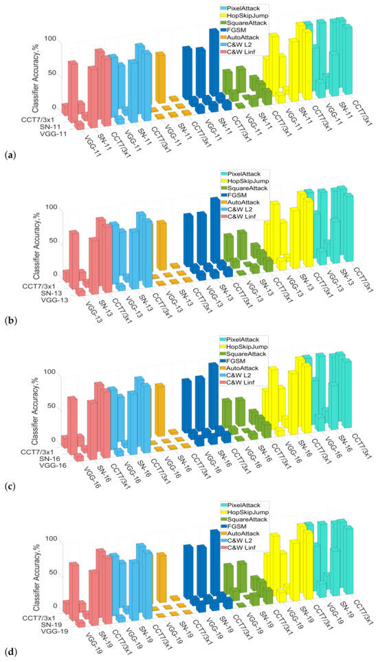 In the case of CCT-7/3 × 1, transferability was not bidirectional, meaning that some examples were transferable from one model to another but not the other way around. In the case of PixelAttack, the adversarial examples were not transferable either way between VGG and CCT or between SpinalNet and CCT. This introduces the simplest form of perturbations that are not enough to mislead the neural architectures such as CNN and Neural Transformer. In the cases of C&W and HopSkipJump, the adversarial examples were somewhat transferable from CCT to both SpinalNet and VGG and even more in the case of C&W but not the other way around. In the case of AutoAttack, however, the adversarial examples crafted using the CCT-7/3 × 1 were partially transferable to SpinalNet and VGG and almost fully transferable the other way around. The SquareAttack examples, on the other hand, were partially transferable both ways. Finally, an interesting result was observed in the case of the FGSM. As mentioned earlier, the CCT-7/3 × 1 demonstrated the best robustness result against the FGSM attack. However, when examples crafted using the said attack were transferred from surrogate CNN-based models, the CCT-7/3 × 1 model appeared to be fooled, and the accuracy dropped to between 10 and 13% for all tested cases. The difference in the architectures of CNN and transformer-based neural networks can explain such behavior. But here, we should remember that CCT also has convolutional layers. For instance, CNNs are known for their shift-invariance with input layers designed to extract simple features, and the layers closer to output typically extract high-frequency features. On the contrary, shift-equivariant attention blocks of transformers are responsible for lower-order features [45]. In addition, neural transformers are powerful tools in processing a large volume of spatiotemporal data [46]. Therefore, adversarial perturbations designed for certain architecture have different levels of transferability. If models share similar capturing features, attacks have low transferability.