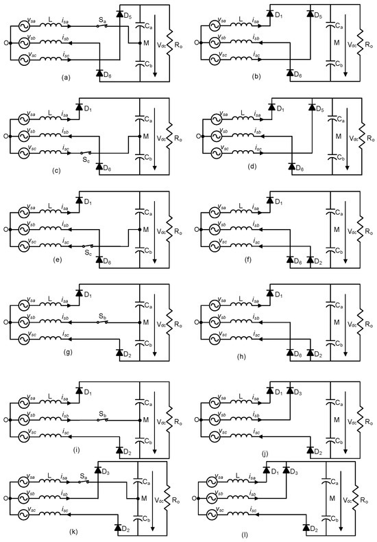 Figure 4 illustrates six topological stages corresponding to the half-cycle (0° to 180°) of the phase voltage vsa. For ease of analysis, only the components with current flow in each stage are depicted.