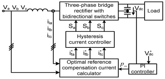 To validate the unique characteristics of the proposed control method for the UPF three-phase rectifier, a simulation model was established in MATLAB, as depicted in Figure 6. The simulation model primarily consists of the HCC, an optimal compensation current calculator, and the UPF three-phase rectifier linked with a PI controller for DC voltage, which compares the actual value of the DC voltage vdc with its corresponding reference value v*dc and outputs the active loss . This also includes the losses of bidirectional switches and the capacitor at the DC side. The parameters of the PI controller are Kp = 1, and Ki = 0.001, respectively.