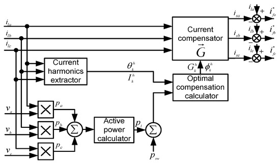 where and are the valid values of power voltage and active compensation net of the hth harmonic in the k-phase, respectively.