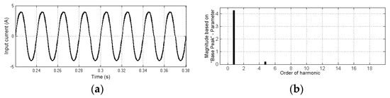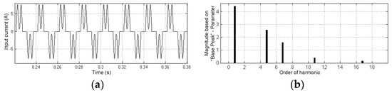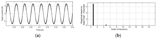Figure 9 displays the waveform and harmonic spectrum of the input phase current of the UPF converter under the proposed control at rated power. Meanwhile, the corresponding waveform of the traditional converter is depicted in Figure 10.