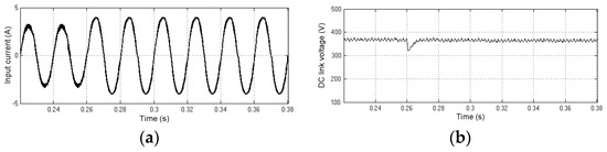 Figure 13 illustrates the waveforms of the input phase current and DC link voltage in response to a sudden change in the converter’s output power from 50% to 100% of its rated value due to a load disturbance. During stable operation, the load changes at 0.26 s. The converter is observed to swiftly return to a steady DC link voltage in less than 0.01 s, demonstrating its robust response to sudden load variations. Therefore, the proposed control method exhibits commendable flexibility in accommodating load variations.
