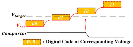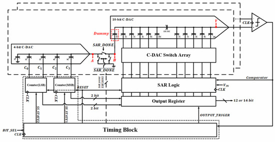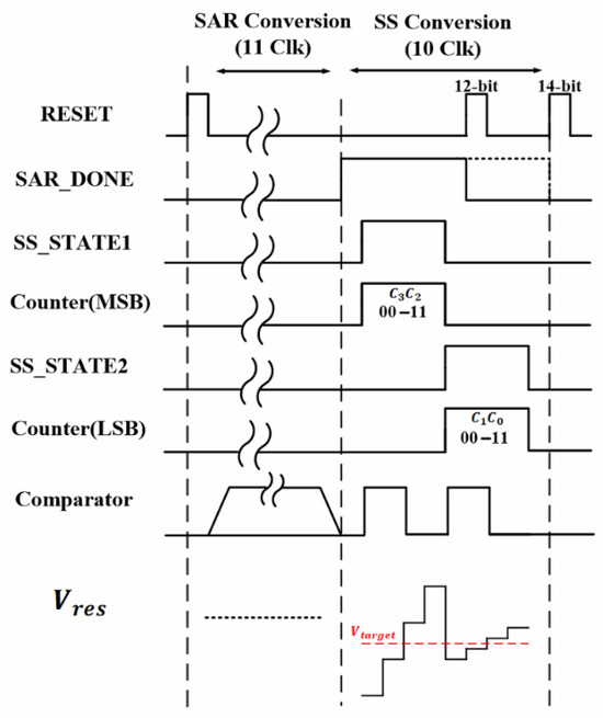 The flow chart of the linear search algorithm (12-bit mode) and jump search algorithm (14-bit mode) of the proposed ADC is presented in Figure 3. The residue voltage of the conventional 10-bit C-DAC is applied to the negative input of the comparator to make a comparison with the sampled target voltage at the starting point of the algorithm when the SS ADC begins to operate. If becomes less than , the residue voltage continues to be renewed to , where is the voltage associated with the least significant bit of the 12 bits. If becomes greater than and (bit selection external signal) is equal to 12 bits at the same time, MSB 2-bits () are determined by the linear search algorithm and stored in the register of the 12-bit mode, as shown in the dotted upper box of Figure 3. Otherwise, and n are set to and 0, respectively, and continues to be renewed to until becomes less than . If becomes less than , LSB 2-bits () is determined by the jump search algorithm and stored in the register of the 14-bit mode, as shown in the dotted lower box of Figure 3.