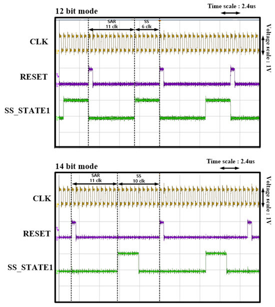 Figure 9 shows a photograph taken with an oscilloscope from the timing diagram of the proposed ADC. It shows the SS_STATE1 and RESET signals as the BIT_SEL signal switches between 0 and 1. In both the 12-bit and 14-bit modes, the SAR operation takes place for a duration of 10 clock cycles. However, in the 14-bit mode, due to the longer SS operation, it can be observed that the RESET signal is delayed by an additional 5 clock cycles.