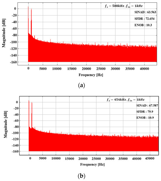 The measured fast Fourier transform (FFT) results are presented in Figure 11 in order of resolution (12 or 14 bits). The input frequencies are 1 kHz, respectively. In the 14-bit mode, the signal-to-noise and distortion ratio (SNDR) is 67.5 dB, and the effective number of bits (ENOB) is 10.9 bits.