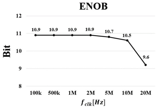 Figure 12 depicts the variation of ENOB for the proposed ADC as the clock frequency changes. The clock frequency ranges from 100 kHz to 20 MHz, while the input frequency remains fixed at 1 kHz. The measured ENOB maintains 10.9 bits up to a clock frequency of 2 MHz, and then starts to degrade. Figure 13 illustrates the ENOB variation when the clock frequency is fixed at 2 MHz and the input frequency is varied from 1 kHz to 60 kHz. ENOB remains at 10.9 bits up to 5 kHz, after which it decreases.