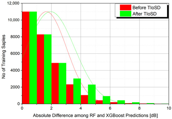 Moreover, it is shown through Table 3 that increasing the number K of folds and N of base learners leads to smaller error values. However, the improvement brought by using ten instead of five folds is quite small (0.01 dB). Apart from that, the employment of three instead of two base learners, led also to a marginal improvement of 0.01 dB. It is worth mentioning that the third base learner utilized the LightGBM algorithm, which falls under the boosting category, similar to the first algorithm XGBoost. This is the reason why its incorporation within the ensemble did not have much to offer. For all combinations of K and N, the benefit of applying the TIoSD method led to an error reduction that fluctuated between 0.08 dB and 0.12 dB in comparison with the conventional ensemble.