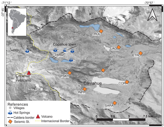- Montenegro, V.M.; Spagnotto, S.; Legrand, D.; Caselli, A.T. Seismic evidence of the active regional tectonic faults and the Copahue volcano, at Caviahue Caldera, Argentina. Bull. Volcanol. 2021, 83, 20. [Google Scholar] [CrossRef]