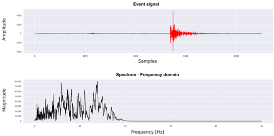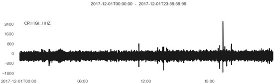 In this study, we focused on the seismic traces recorded at the HIGI station, since more tectonic events were found in proximity to HIGI, and structural models suggested that the magmatic chamber was also situated to the east of the volcanic cone. Moreover, the data quality of the HIGI station was superior to that of TERM, which was possibly due to the presence of geothermal emanations causing noise [35]. Installed at coordinates 37.851° S, 71.030° W and an elevation of 1637 m above sea level, it was situated in the old Hueney campsite. It was positioned on a cement base above a rocky substrate, with an embedding depth of approximately 70 cm. It was composed of a 20-second Trillium Compact sensor controlled by a 24-bit A/D converter sampling at 100 Hz. Also, the HIGI station worked correctly during the entire data acquisition phase. For illustrative purposes, a seismic trace recorded at the HIGI station is shown in Figure 2.