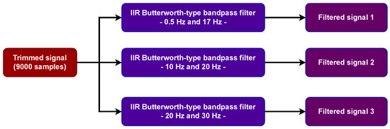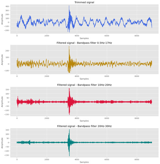 Data curation and enrichment were performed to generate a dataset to train the ML-based model. The 24 h long traces were preprocessed with a Butterworth bandpass infinite impulse response (IIR) filter with order [37] applied to the complete trace, with 0.5 Hz and 17 Hz cutoff frequencies. Subsequently, the long traces were trimmed (hereafter referred to as trimmed signal). The corresponding digital cutoff frequencies were fixed at 0.01 and 0.35 rad/sample. Additionally, two bandpass filters defined with cutoff frequencies between 10 Hz and 20 Hz and between 20 Hz and 30 Hz were applied to the clipped signals. The steps of the filtering process are shown in Figure 3. Each IIR filter introduced zero phase distortion, which was achieved through forward and backward filtering [38]. The selected observation time was 1 min 30 s, equivalent to 9000 samples. The time window was chosen based on the duration of the identified volcanic tectonic events.