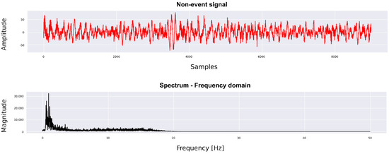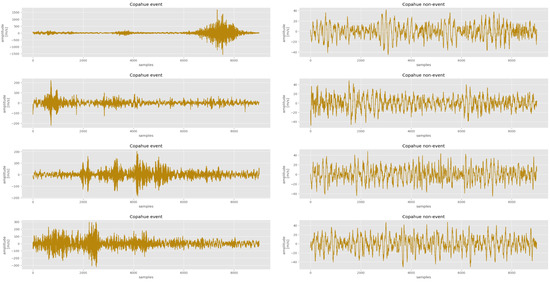 Because it is desirable to distinguish events from noise signals, a binary classification was proposed using ML as a starting point for further discrimination among various types of events. Examples of the events and noise signals are shown in Figure 4. This group of events comprises volcanic tectonic and tremor signals. The dataset generated for training comprised 15,052 entries that included the extracted features and the corresponding classes (divided into event and non-event). We employed a well-balanced dataset to prevent the model from being biased towards the class with a higher number of elements. A multichannel approach was employed for binary classification, which implied that the signals used for training, validation, and testing were obtained from each channel: vertical, eastern, and northern.